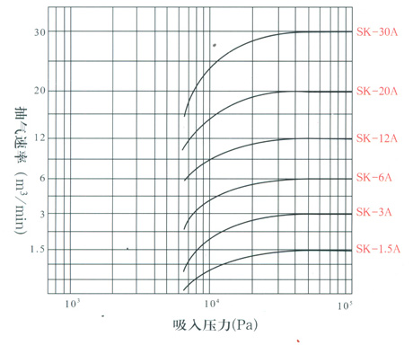 应用范围及特点 SK水环式真空泵,广泛适用于化工机构、石油、轻工、医药、食品等工业行业用来抽吸空气或其它不溶于水、不含固体颗粒、无腐蚀性的气体,以便在密闭容器中形成一定的真空度。常用于真空蒸发、真空脱水、真空浓缩、真空干燥、真空过滤、真空送料等工艺过程中,尤其适用于需要清洁,无油有大量水蒸气溢出的抽气过程。 泵采用特殊材料制造时,允许抽除部分带有少量腐蚀性的气体。 采用防爆电机时,遵守相应的安全规则下,可抽除一般的易燃易爆性气体。 本水环泵采用机械密封结构,具有结构紧凑、密封性好、使用可靠、装拆方便,维修简单等特点。 特性曲线