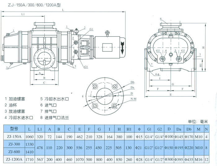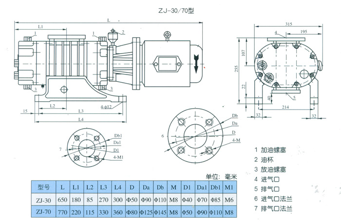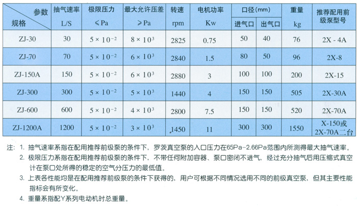 使用范围 ZJ系列罗茨真空泵是一种旋转式变容真空泵,须有前级泵配合方可使用,在较宽的压力范围内有较大的抽速,对被抽除气体中含有灰尘和水蒸气不敏感,广泛用于冶金、化工、造纸、食品、电子工业部门。 规格及主要技术参数
